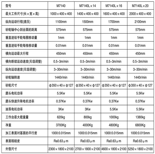 此平面磨床以砂輪周邊或側(cè)面磨削工件的平面,工件可以固定在工作臺(tái)上,或吸牢在電磁吸盤上,其材質(zhì)可以是鋼、鑄鐵、石墨、或有色金屬。機(jī)床工作臺(tái)的左右和磨頭的前后運(yùn)動(dòng)都是用液壓驅(qū)動(dòng),無(wú)極調(diào)速。磨頭的前后運(yùn)動(dòng)也可手動(dòng)操作。磨頭的垂直方向除手動(dòng)進(jìn)刀外還配有快速升降機(jī)構(gòu),減輕勞動(dòng)強(qiáng)度提高效率。